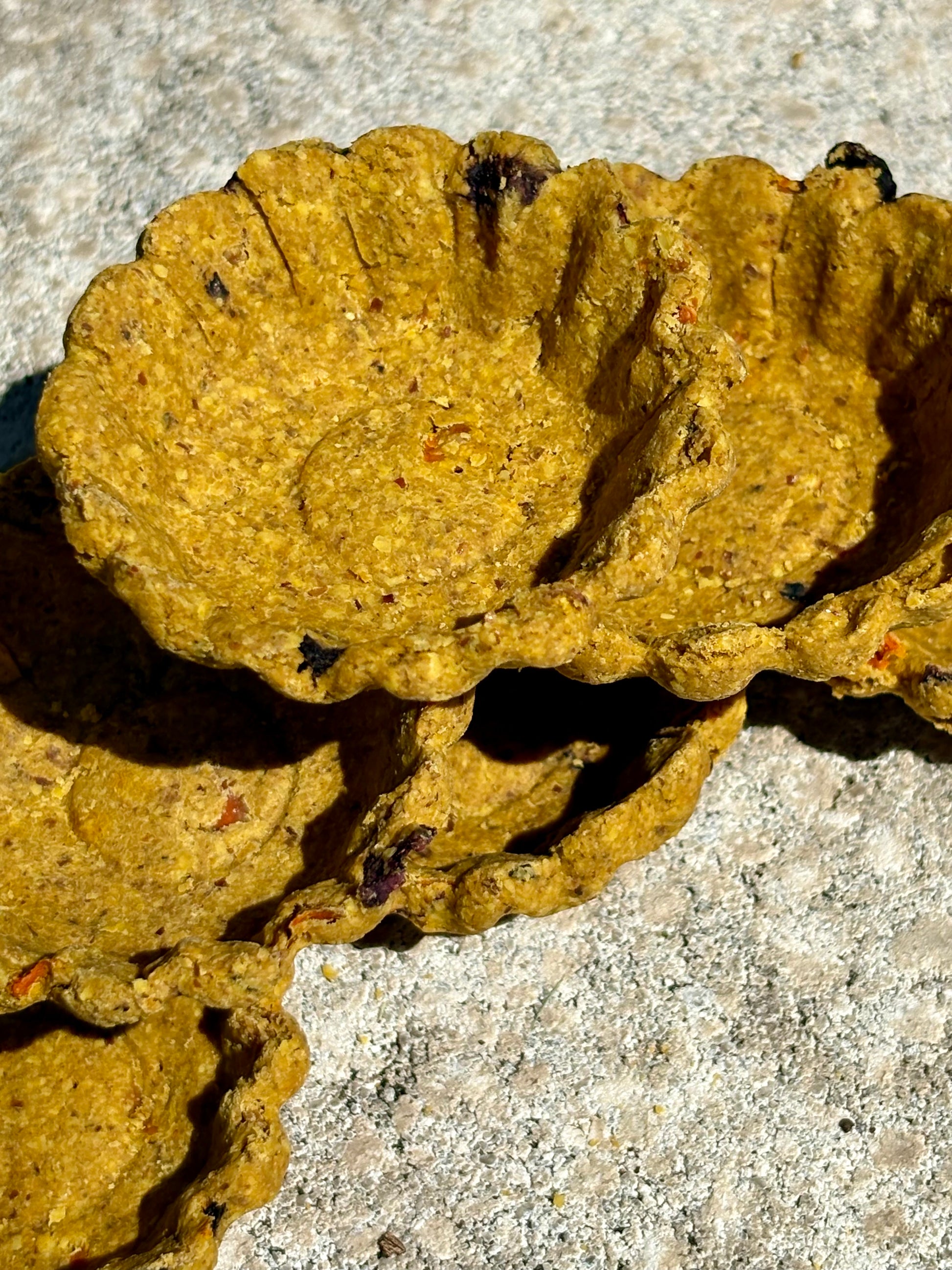 Ground oats, shredded carrots, pumpkin purée, ground flaxseed, coconut oil, turmeric, ground ginger, blueberries.
